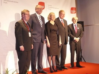 Puoluekokouksessa Joensuussa entiset puheenjohtajat Pertti Paasio, Eero Heinäluoma, Paavo Lipponen & Ulf Sundqvist yhdessä uudelleen puheenjohtajaksi valitun Jutta Urpilaisen kanssa.